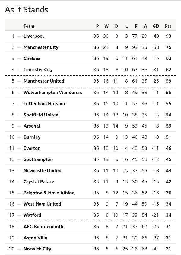 How Premier League Table Looks Like As United Chelsea Make Ucl Springnewsng